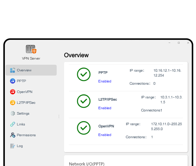 TerraMaster VPN Server unterstützt PPTP-, OpenVPN- und L2TP/IPsec-Protokolle und ermöglicht es ihm somit, sich an verschiedene Netzwerkumgebungen anzupassen, um eine Vielzahl von Geschäftsanforderungen zu erfüllen.