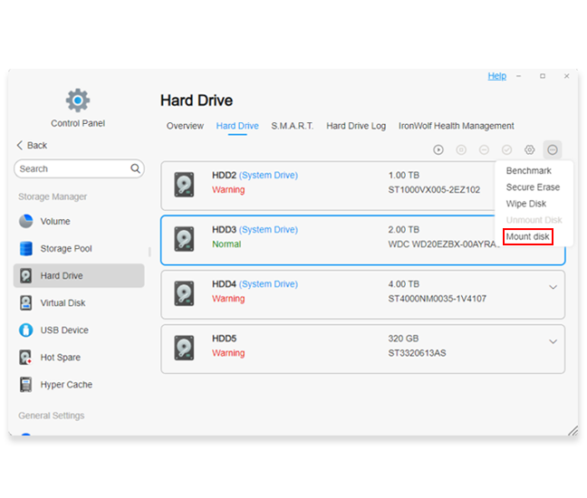 3. Log in to your TOS and navigate to ""TOS > Control Panel > Storage Manager > Hard Drive."" This will take you to the hard drive management interface, where you can manage your hard drives.