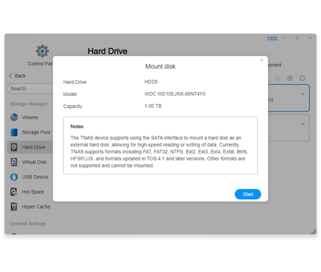 1. Your TNAS device must have at least one system drive running TOS 6.0.x. This ensures that your device supports the direct mounting feature. The system drive can be either an HDD or an SSD, as long as it is running the required operating system version.