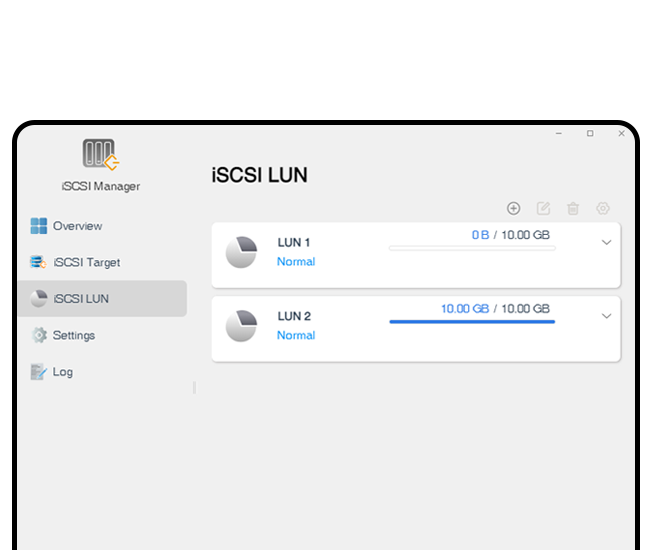 NAS is widely used as a storage device for virtualized computing, and TerraMaster iSCSI Manager allows the creation of multiple iSCSI targets and LUNs on the TNAS to facilitate this. The customization of the available capacity, permissions, and connections through a graphical interface helps you meet your storage space requirements across a range of virtualization environments.