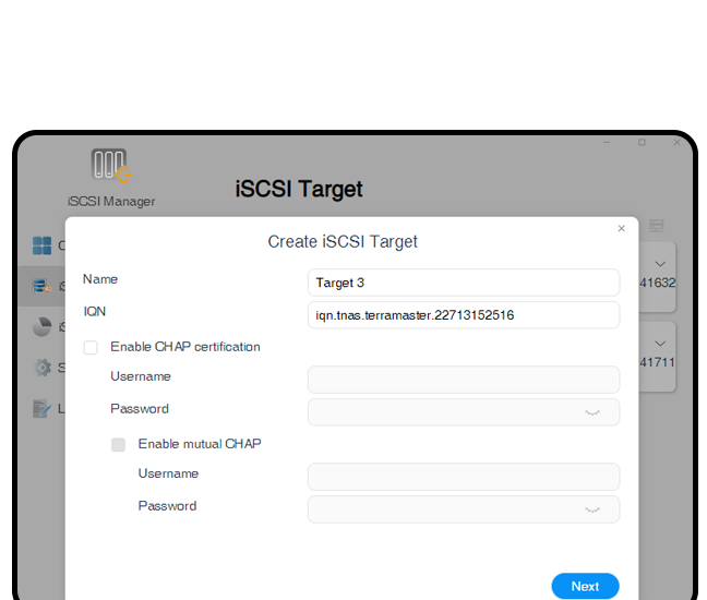 Using iSCSI Manager allows the creation of multiple iSCSI targets on the TNAS, with customize IQNs for ease of identification. You can also choose to enable authentication or mutual authentication for each iSCSI Target to increase access security.