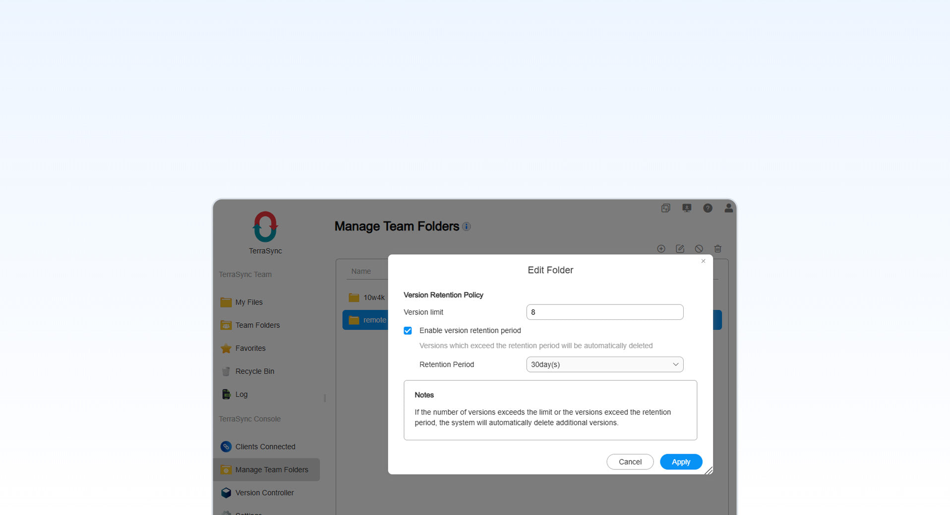 TerraSync innovatively introduces "Dual-Dimension Auto Cleanup" technology, which intelligently and efficiently manages file versions based on two key dimensions: the number of versions and the retention period. Users can flexibly customize cleanup rules according to their actual needs, effectively preventing excessive accumulation of file versions and avoiding unnecessary occupation of large amounts of storage space. This ensures optimal configuration and efficient utilization of storage resources.