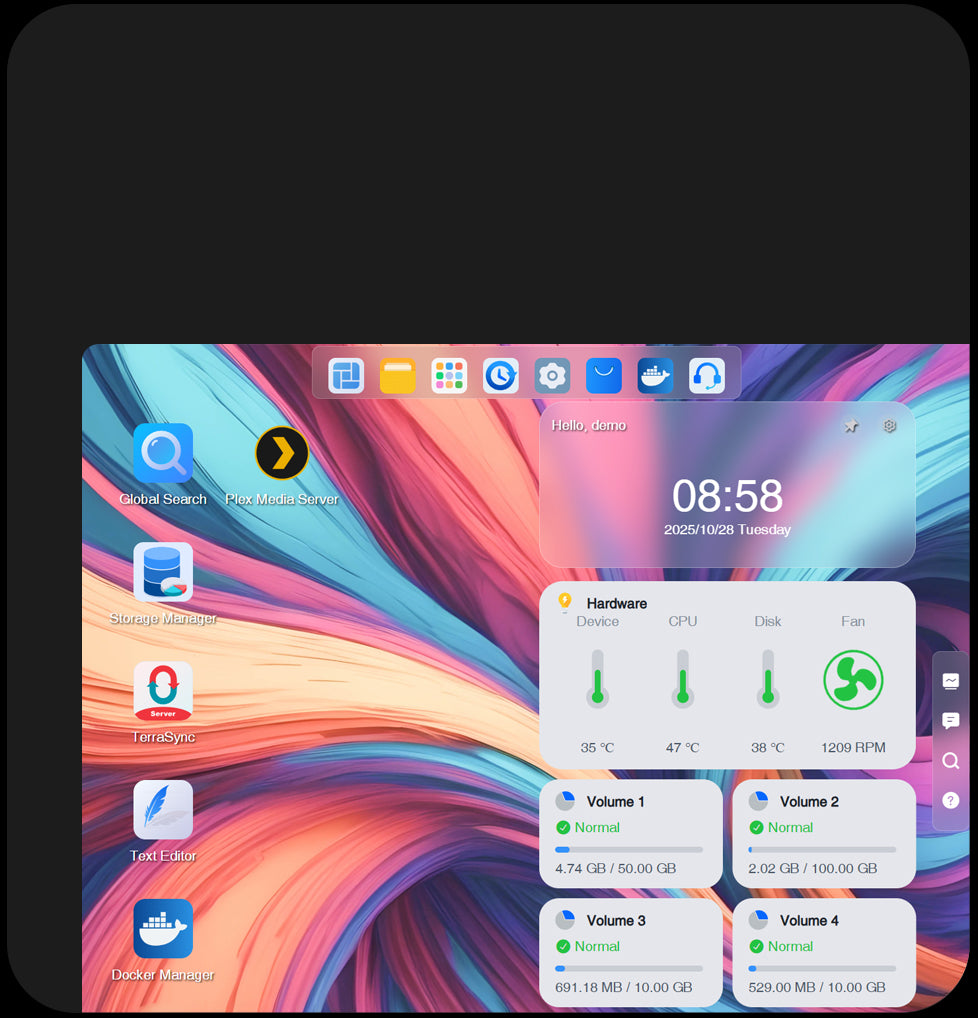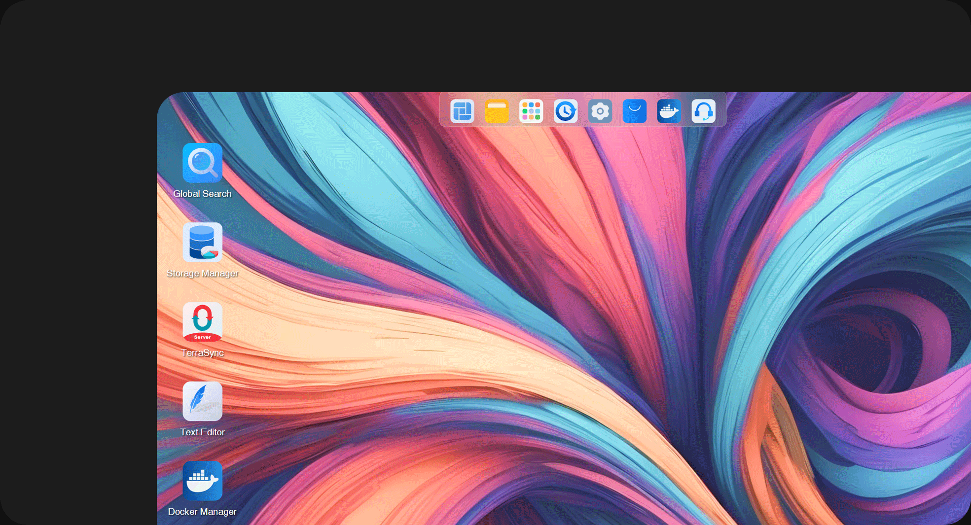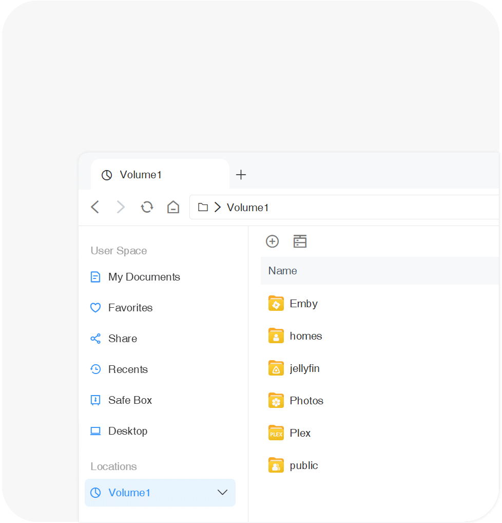 In TOS 7, the file management application has been fully upgraded and optimized. "My Files" and "Desktop" functions have been added to the user space, supporting remote file mounting. The intuitive graphical management interface lets you handle storage, addition, deletion, modification, and queries with ease.