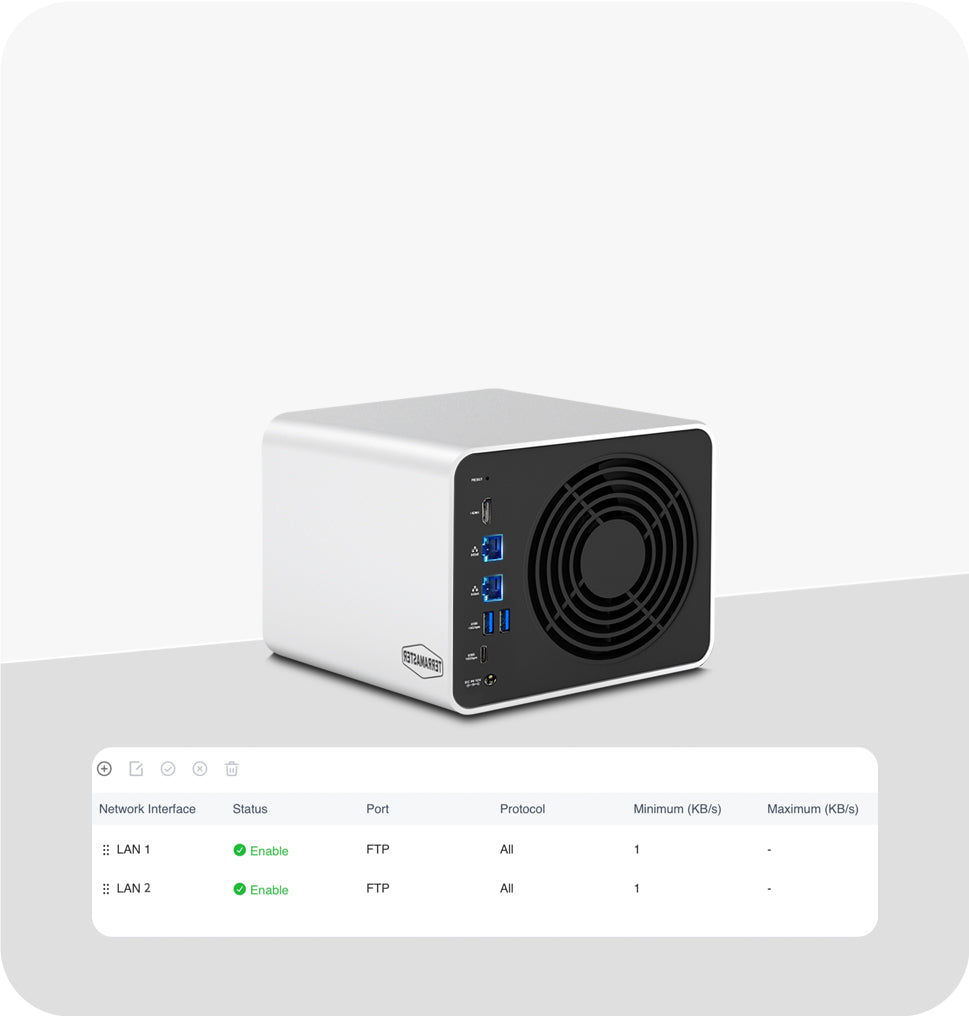 TOS 7 adds network port speed limiting functionality. You can manage each network interface based on service or terminal, effectively preventing a single service/device from occupying all bandwidth, ensuring reasonable allocation of network resources. Whether you are an enterprise or an individual user, this allows for more rational utilization of network resources.