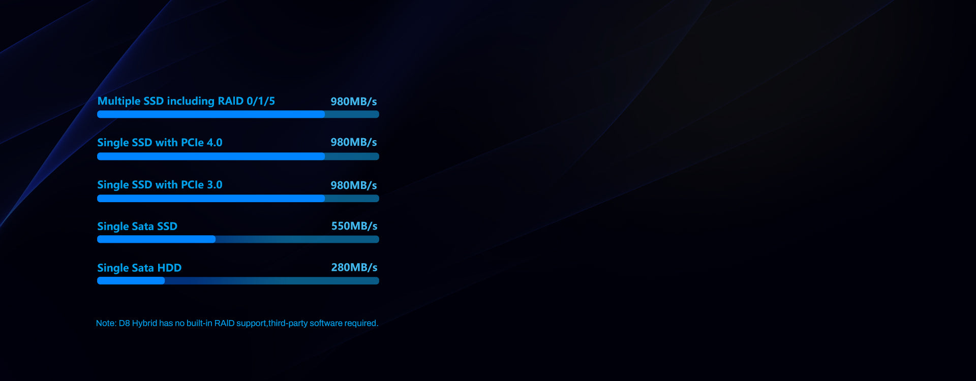 Bande passante de transfert de 10 Gbit/s : Le boîtier de disque dur hybride D8 adopte le protocole USB 3.2 Gen2 pour une transmission de données à haut débit jusqu'à 10 Gbit/s. Avec un SSD, la vitesse peut atteindre 521 Mo/s, et avec un SSD NVMe M.2, 980 Mo/s.