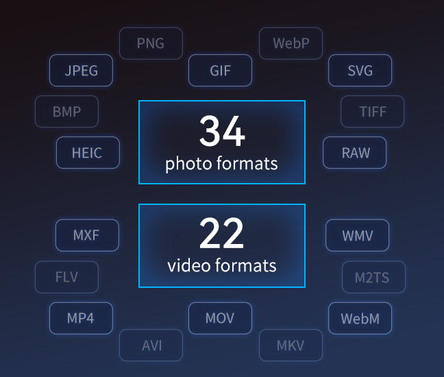 Photos는 34개의 사진 형식과 22개의 비디오 형식을 포함한 다양한 일반 사진 및 비디오 형식을 지원합니다. 호환성 문제에 대해 걱정할 필요 없이 제한 없는 다양한 미디어 경험을 즐길 수 있습니다.