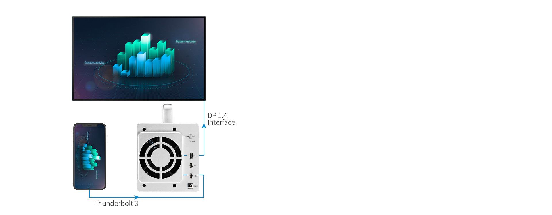 2. Two 40Gbps Thunderbolt 3 interfaces, reading speeds up to 760MB/s (with SSHD in RAID 0). Compatible with 3.5" and 2.5" SATA HDD, 2.5" SATA SSD.