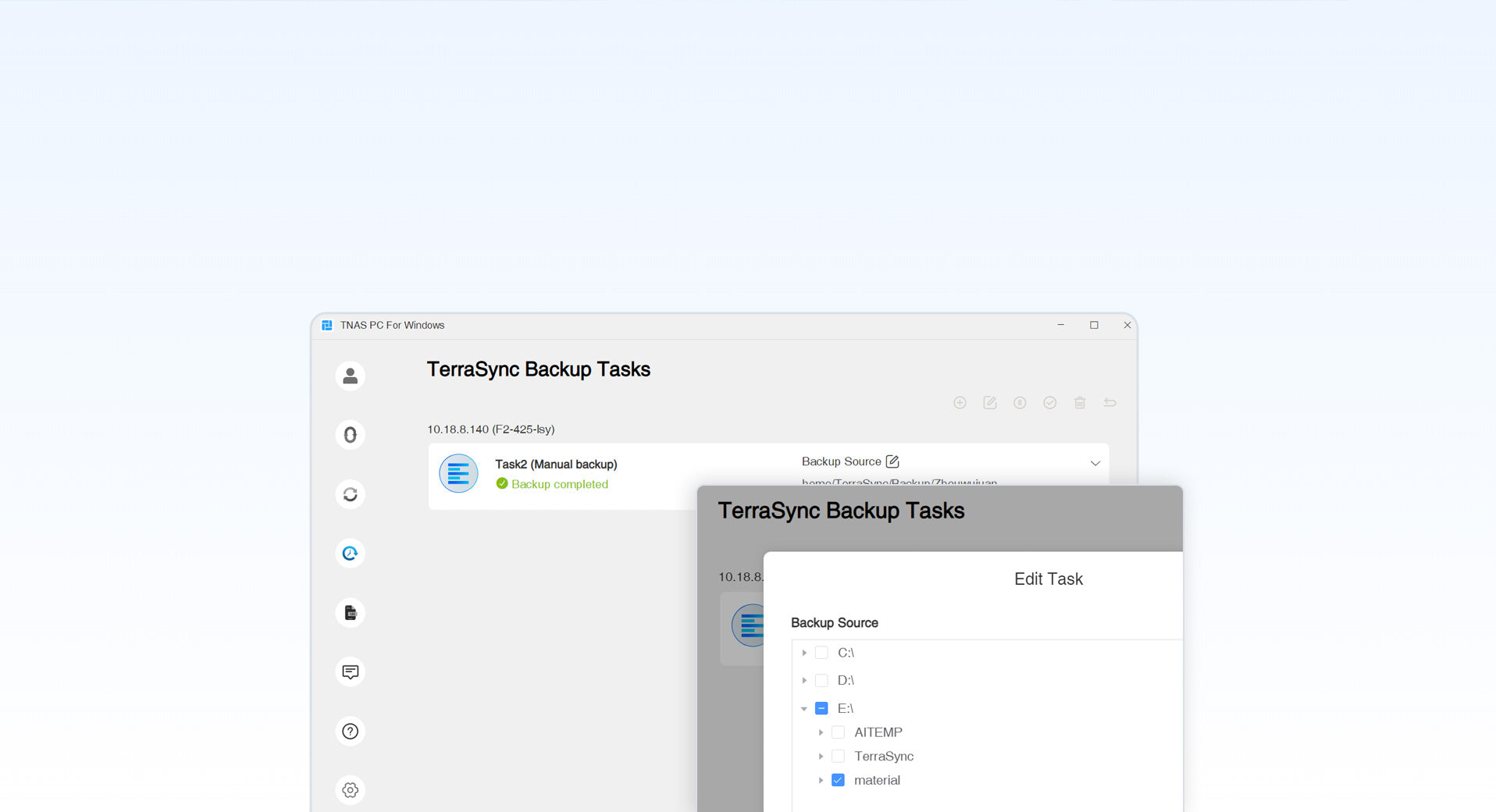 In addition to providing efficient file synchronization services, TerraSync's desktop client also supports backing up computer directories. Users can precisely back up specified folders to TNAS devices according to their needs. Leveraging TerraSync's comprehensive historical version records, users can also quickly and accurately restore files.