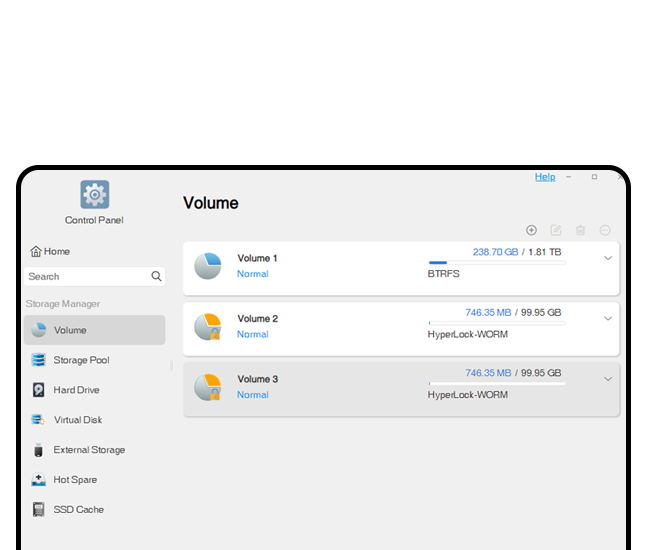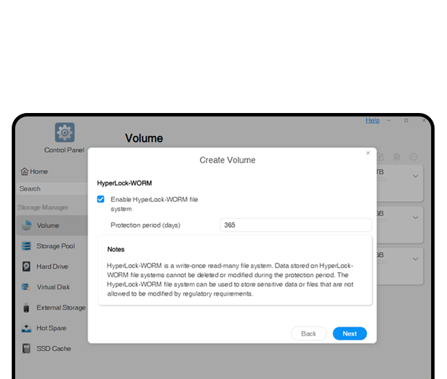 En comparación con otras soluciones de almacenamiento con características WORM, el sistema de archivos TerraMaster HyperLock-WORM aporta más seguridad. Una vez creado el sistema de archivos TerraMaster HyperLock-WORM, ni siquiera un administrador podrá eliminar o modificar la partición de almacenamiento desde la página del menú o el background del sistema. Siempre que el dispositivo de almacenamiento esté ubicado de forma segura en un entorno aislado, ninguna persona sin acceso a los dispositivos de hardware NAS podrá afectar a los datos, tanto si se trata de empleados con privilegios de administrador como de piratas informáticos.