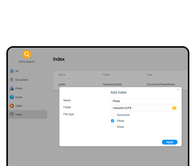 TerraSearch cuenta con un potente motor de búsqueda integrado que, combinado con su gran base de datos, puede manejar fácilmente millones de funciones de gestión de documentos y búsqueda de contenido para buscar cientos de archivos de destino por segundo; el único límite para el rendimiento real está en el rendimiento del hardware del dispositivo TNAS.