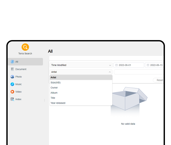 Para muchas instituciones medianas y grandes, encontrar la información requerida entre la vasta cantidad de archivos que tienen almacenados puede ser un gran desafío. Las capacidades de búsqueda de contenido de archivos de Terra Search pueden ayudar a superar este problema, ya que permiten ubicar e identificar rápidamente múltiples tipos de documentos de formatos corrientes que contienen palabras clave de búsqueda, apoyándose sobre una base de datos muy fácil de establecer y una configuración de motor de búsqueda. Así mejora significativamente la eficiencia laboral de la plantilla.