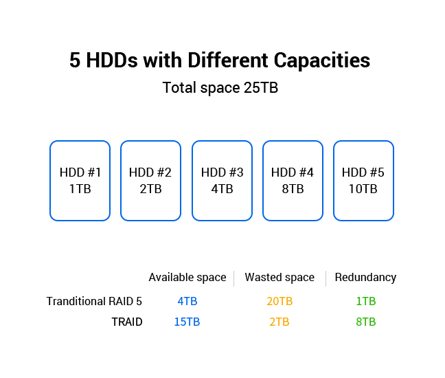 Suppose you need to combine 1TB, 2TB, 4TB, 8TB, 10TB 5 hard drives with different capacities to form a disk array with redundancy protection. In traditional RAID mode (RAID 5), you only get 5TB of usable space. And with TRAID's elastic strategy, you can get 23TB of usable space.