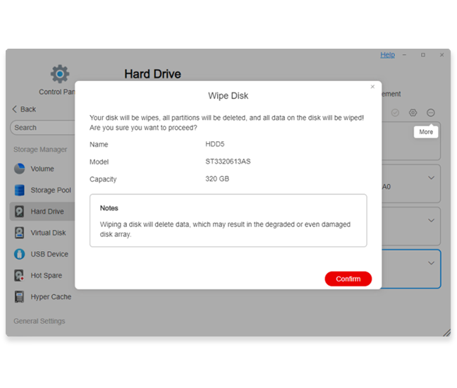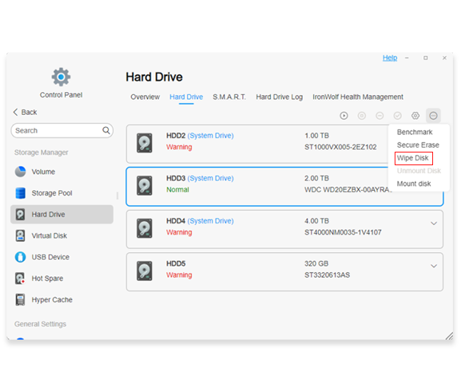 1. [TOS] > [コントロールパネル] > [ストレージマネージャー] > [ハードディスクドライブ] を開きます。このページでワイプしたいディスクを選択します。