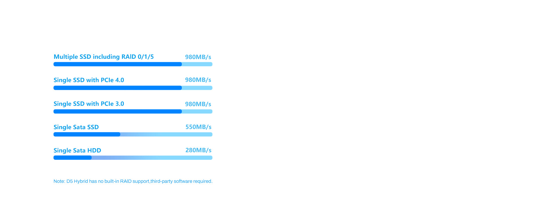 10Gbps Transfer Bandwidth: The D5 Hybrid hard drive enclosure adopts USB 3.2 Gen2 protocol for high-speed data transmission up to 10Gbps. With 2 hard drives in RAID 0, the read/write speed can reach up to 521MB/s (SATA III NAS HDD 8TB x 2). With 2 SSD’s in RAID 0, the read speed can reach 960MB/s (SATA III NAS SSD 1TB x 2), and using an NVMe M.2 SSDs, it can reach up to 980MB/s.