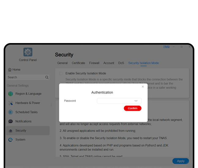 为了防止安全屏障及系统保护措施被攻击及篡改,安全隔离模式采用二次密码验证保护,删除或修改所有与安全保护措施相关的配置信息均需要密码再次验证,效防止黑客对屏障进行破坏。